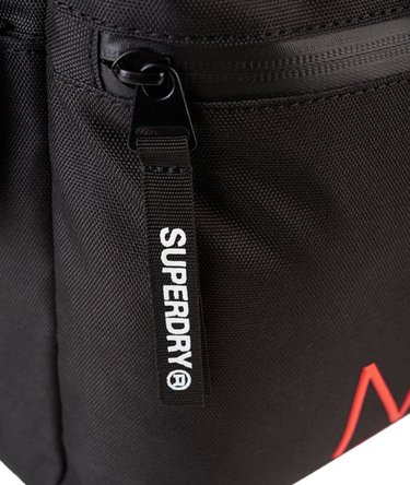 Superdry International Montana ryggsäck. En enkel basryggsäck med bärhandtag på ovansidan, vadderad baksida, vadderade axelremmar och ett rymligt huvudfack. Ryggsäcken har två sidfickor med tryckknappar och ett ytterfack med dragkedja. Det finns även ett Superdry International-tryck i akryl på framsidan och ett International-tryck på ena axelremmen.