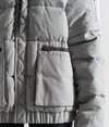 Den här dunjackan är inspirerad av den japanska kimonon med kurvor från halsringningen som på en traditionell kimono och har omformat dem till en dunjacka. Ärmarna på den här jackan kan tas bort helt för att skapa både en långärmad och kortärmad silhuett, vilket ger en mångsidig 2-i-1-design.