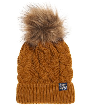 Superdry Arizona kabelstickad mössa för tjejer. Håll dig varm den här säsongen med den här sköna och snygga mössan. Mössan har en kabelstickad design, tofs i fuskpäls och en Superdry-logoflik på kanten.